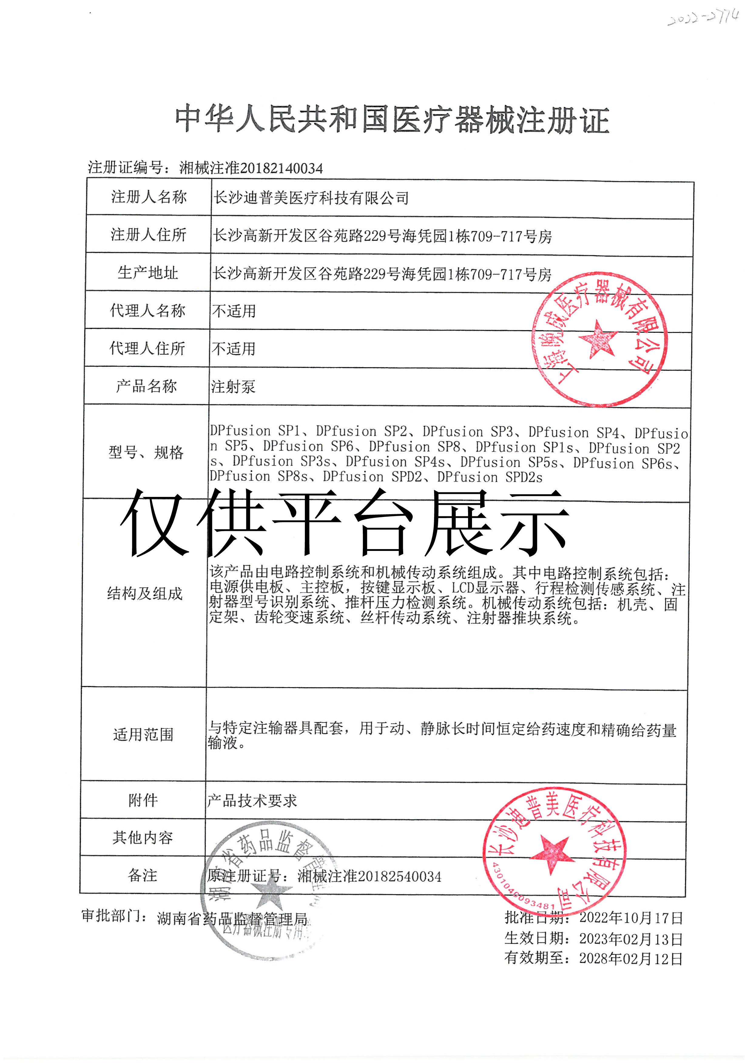 3. 注射速度:50/60mL,0.1~2000.0mL/h;30mL,0.1~1200.0mL/h;20mL,0.1~800.0mL/h;10mL,400.0mL/h;5mL,200.0mL/h;最小增量:0.1mL/h